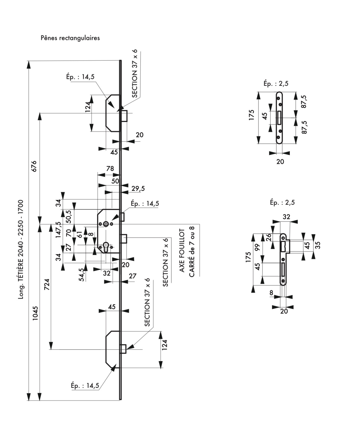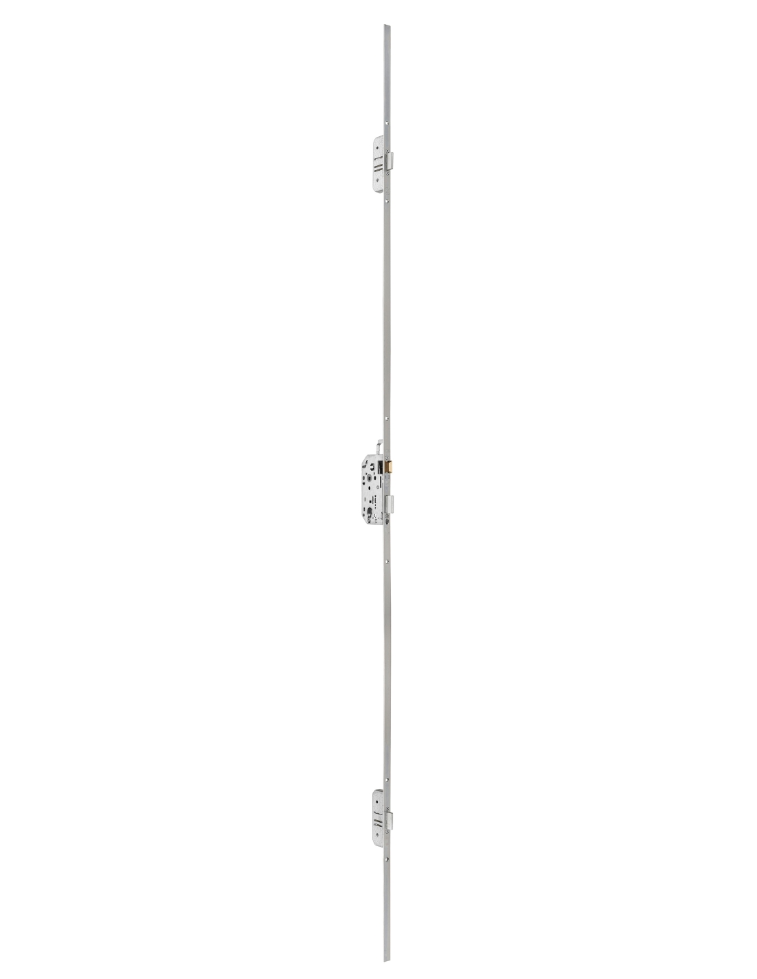 Serratura a cremonese da incasso. Senza riscontro. Chiusura a 3 punti. Asse 50 mm, interasse 70 mm. Quadrato 7 mm.