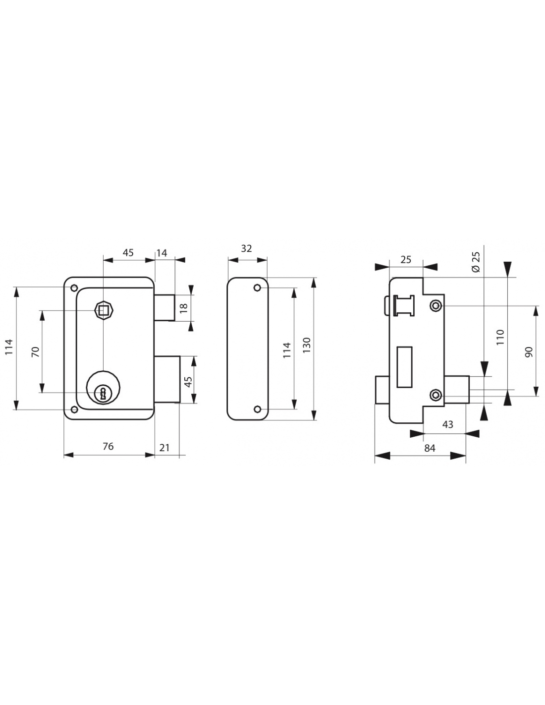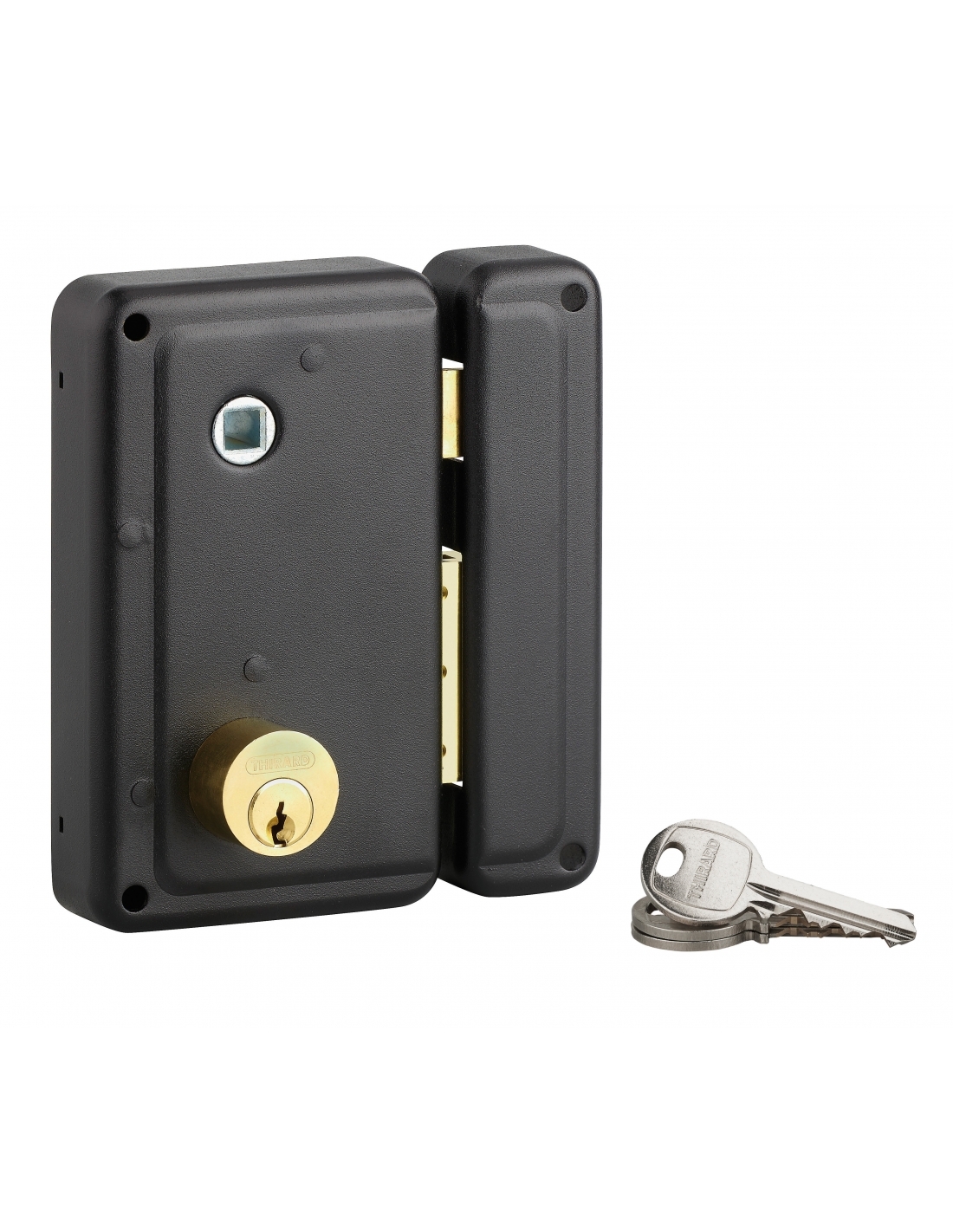 Serratura verticale doppia entrata con pomolo, destra, 76x130 mm, asse 45 mm, nero, 3 chiavi - THIRARD