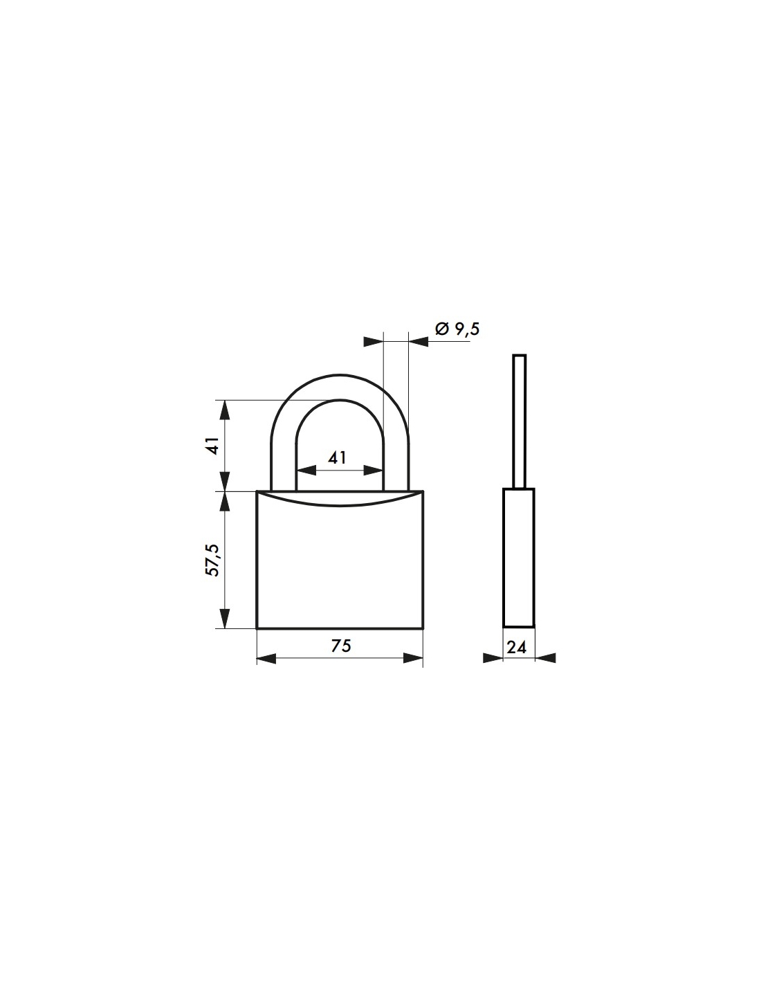 Corpo monoblocco in ottone. Arco in acciaio cementato nichelato. Meccanismo a perni. Doppio ancoraggio. 2 chiavi in acciaio nichelato.