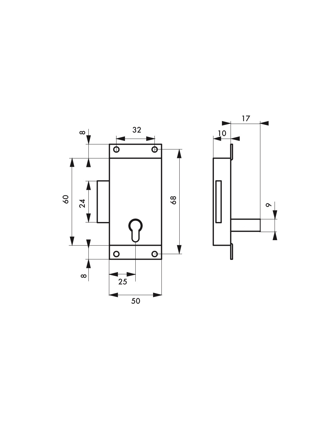 Cassa e catenaccio in acciaio. Installazione a destra o a sinistra. 1 chiave in ottone anticato.