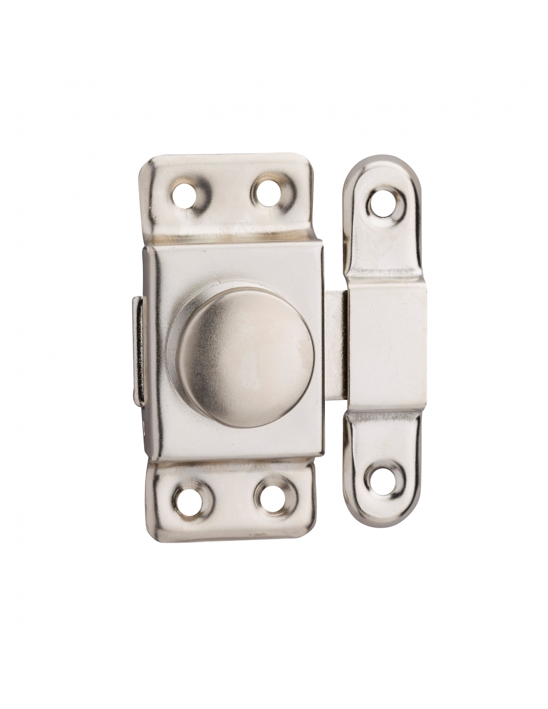 Cassa in acciaio bombato. Controscatto in acciaio bombato. Pomello girevole. Catenaccio piatto. Finitura in acciaio nichelato. Per ante di mobili.