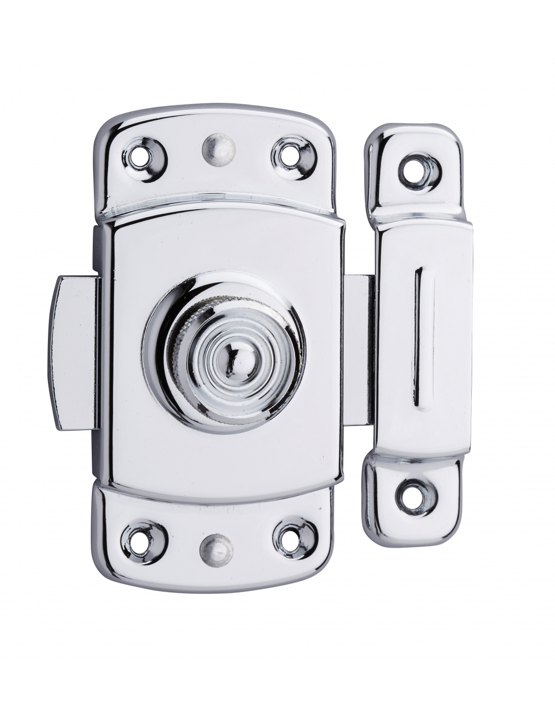 Scatola in ottone stampato cromato. Controscatola in ottone stampato cromato. Pomello in ottone zigrinato. Scrocco in acciaio cromato.