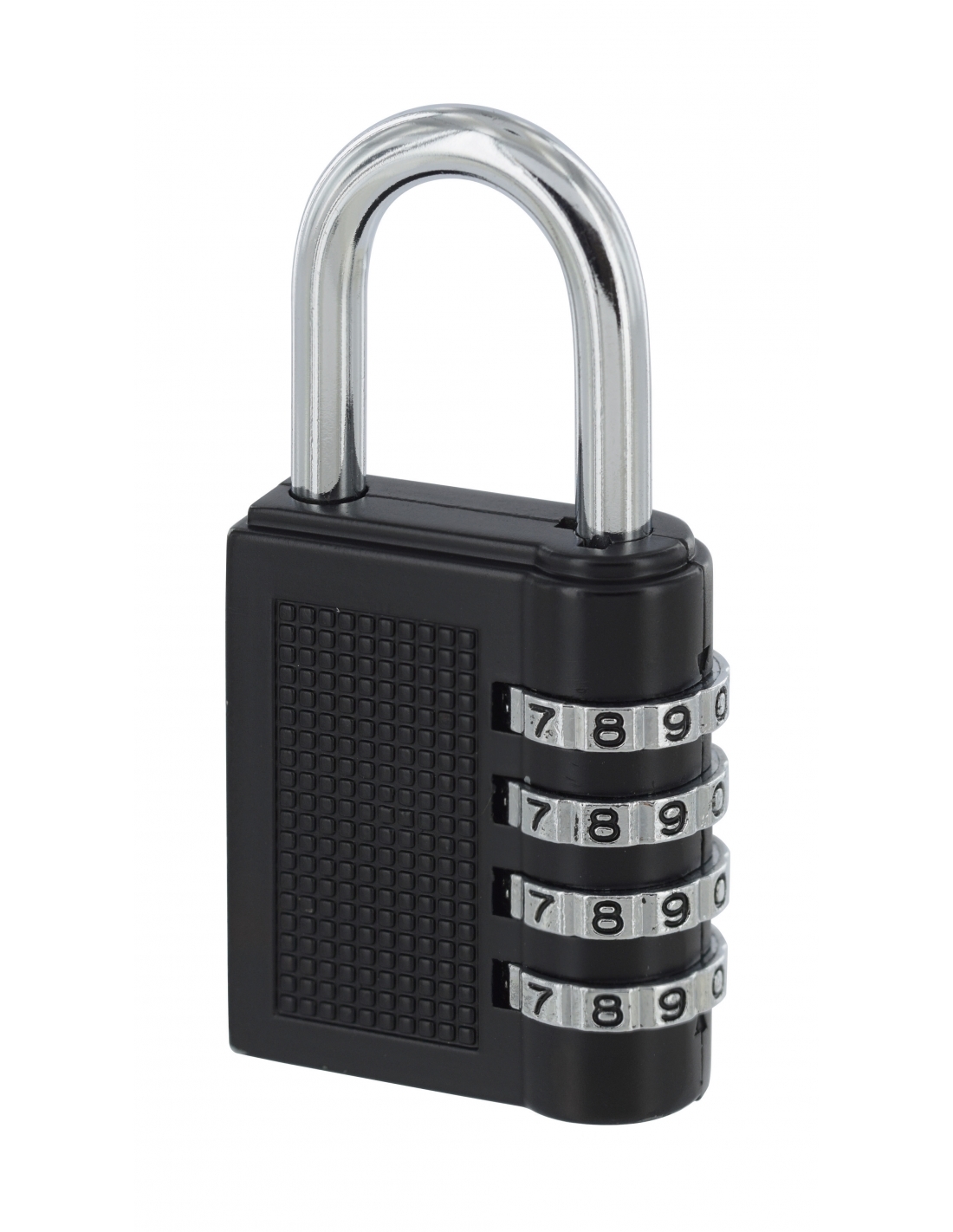 Corpo in lega pressofusa. Arco alto in acciaio nichelato. Meccanismo a 4 ghiere. Combinazione modificabile (10.000 combinazioni possibili).