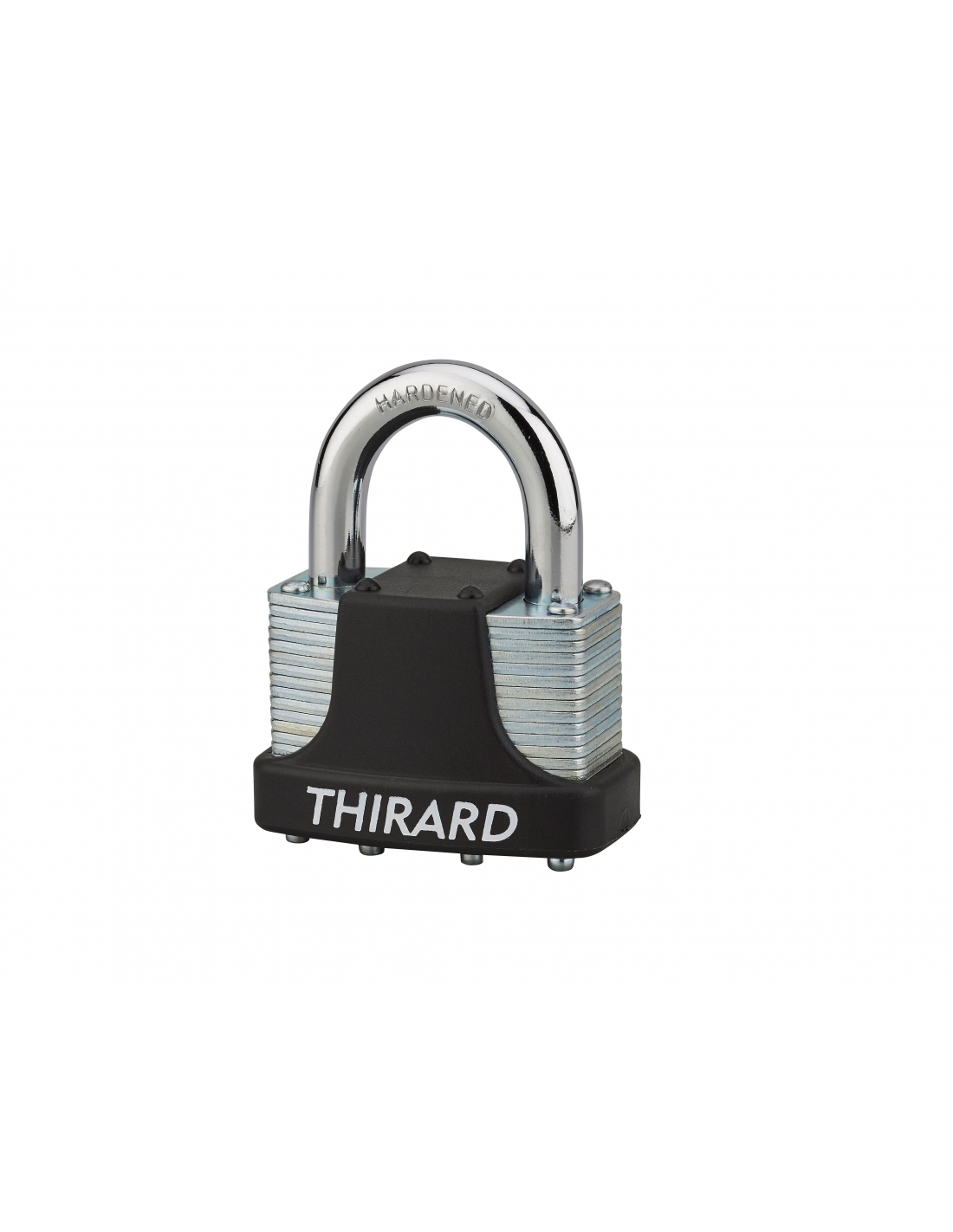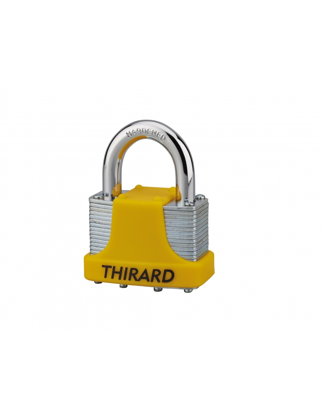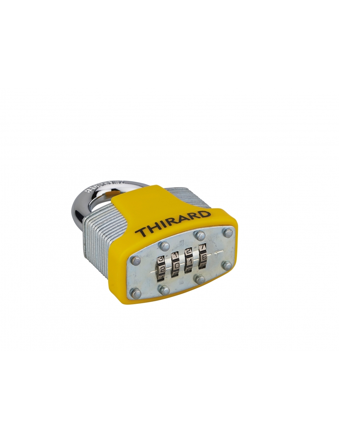 Corpo in lamelle di acciaio zincato protetto con anello in PVC. Arco in acciaio cementato nichelato. Meccanismo a 4 ghiere in ottone. Doppio bloccaggio. Combinazione modificabile, 10.000 combinazioni possibili.