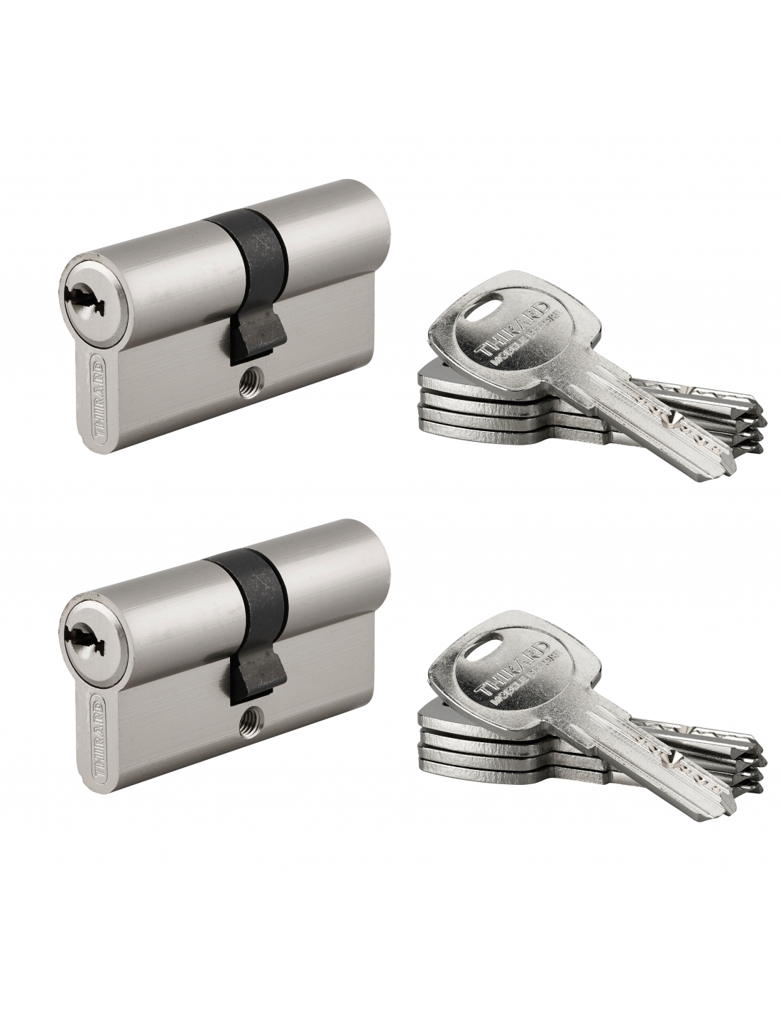 Questo lotto da 2 cilindri doppia entrata in ottone nichelato 30 x 30 mm del marchio Thirard si installa facilmente. Sono dotati di panneton anti-estrazione e di 6 perni, garantendo una chiusura efficace delle porte per assicurare la tua sicurezza e quella dei tuoi beni.